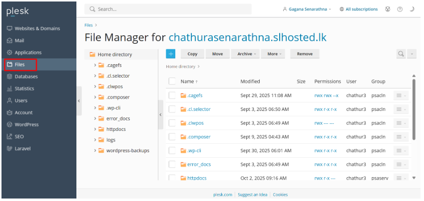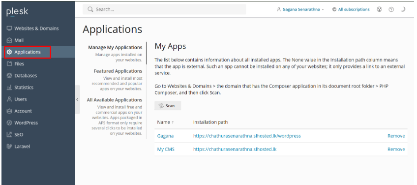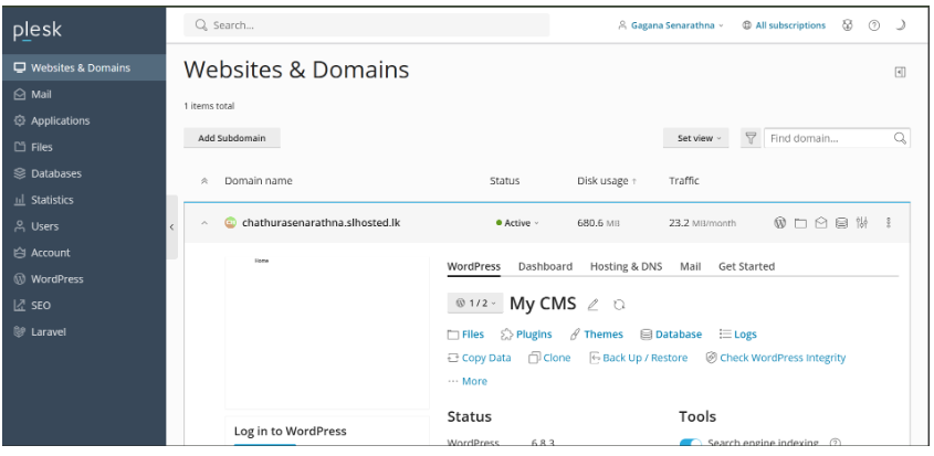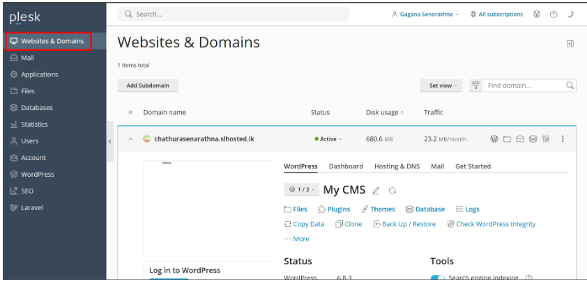 • The Plesk dashboard lets you manage your websites, emails, databases, and applications from one central place.