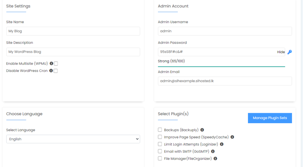 Here, you need to enter the name of your website and a brief description. Then, choose an admin username, password, and email. You will need these details to log in to your WordPress admin panel, so choose a strong password. Select your preferred language and scroll down to proceed.