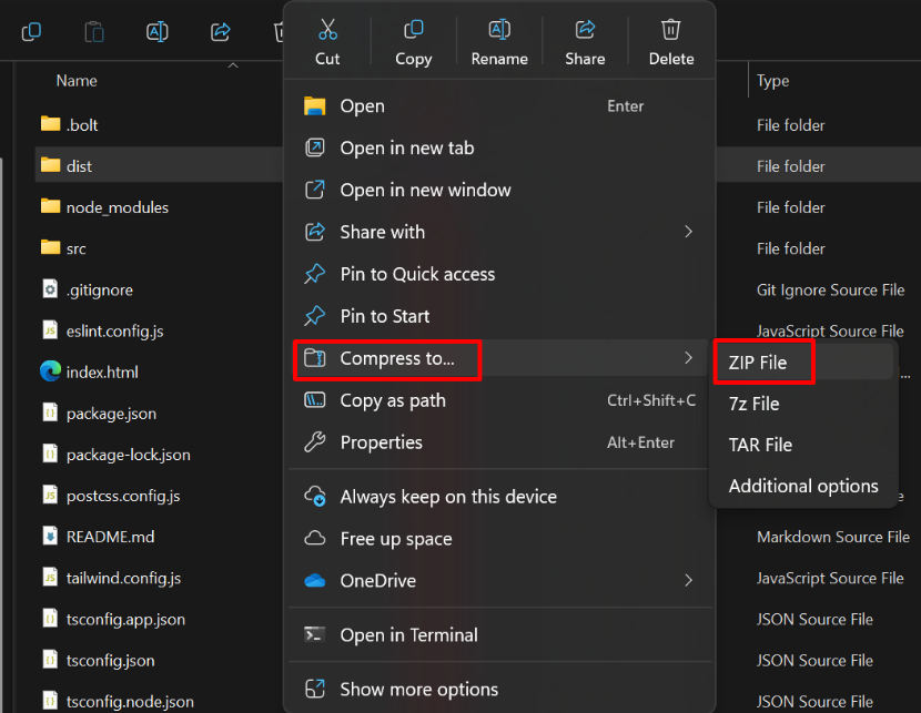 • Right-click → Compress/Zip the folder (you can name it react-build.zip).