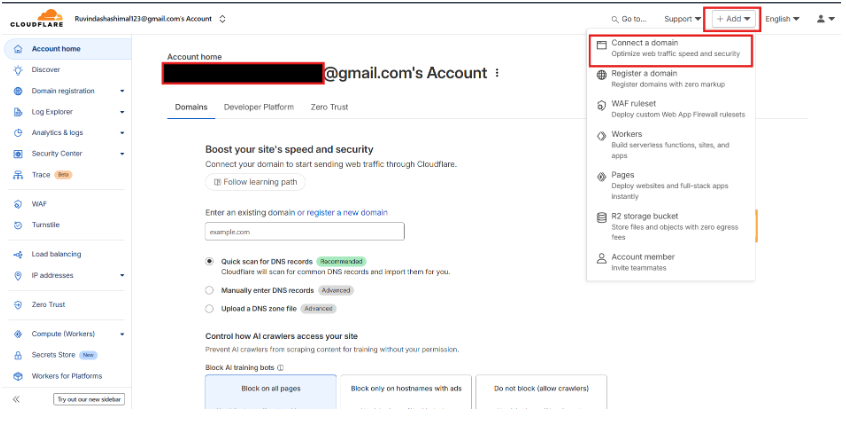 - After logging in to your new Cloudflare account, you will see your Cloudflare dashboard