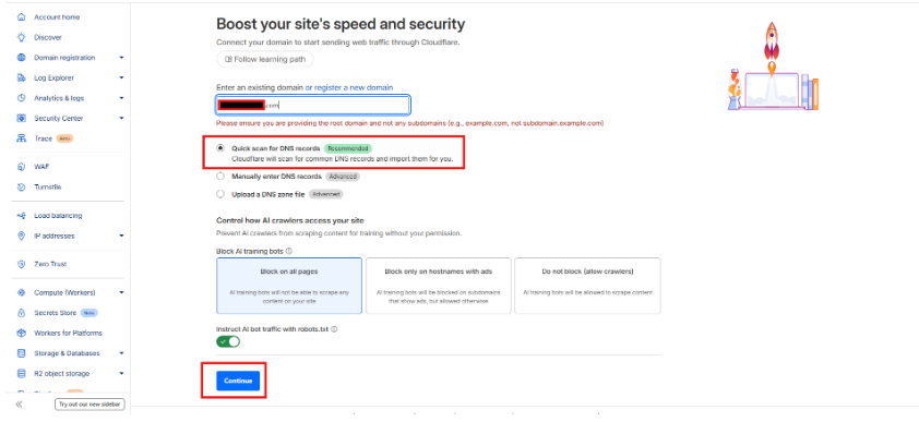 - After you type your domain name, Cloudflare will show some recommended settings for your website.