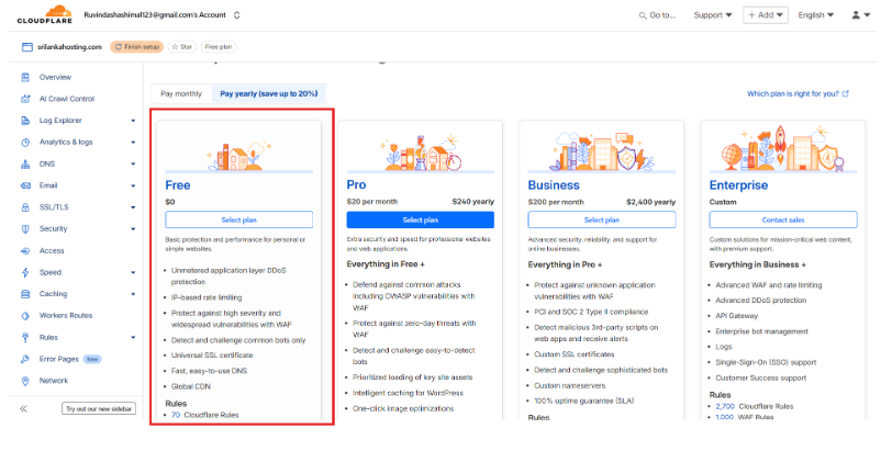 - After adding your domain, Cloudflare will show you several plan options.