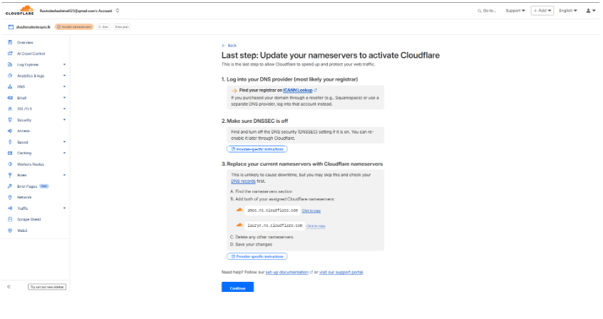 - Cloudflare will provide two nameservers (e.g., anna.ns.cloudflare.com and bob.ns.cloudflare.com).
