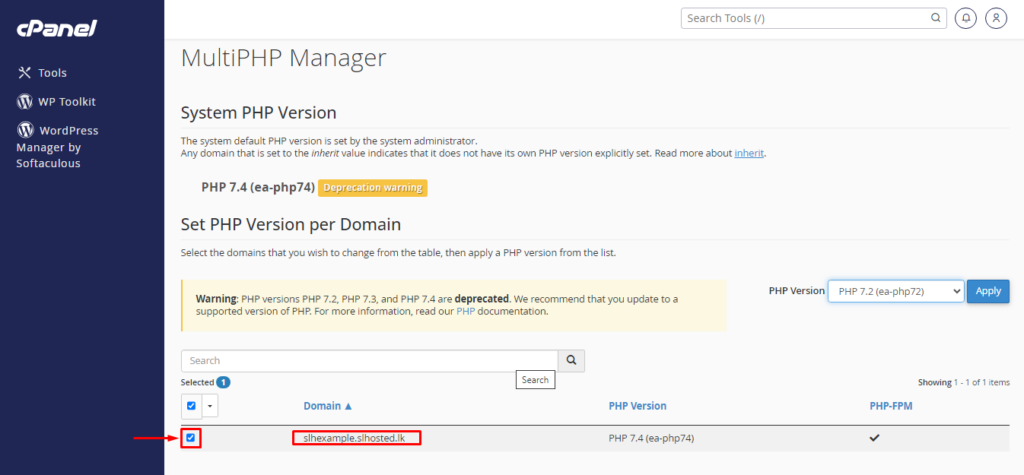 • Then, Select the Dropdown from the right side to select PHP version and click apply.