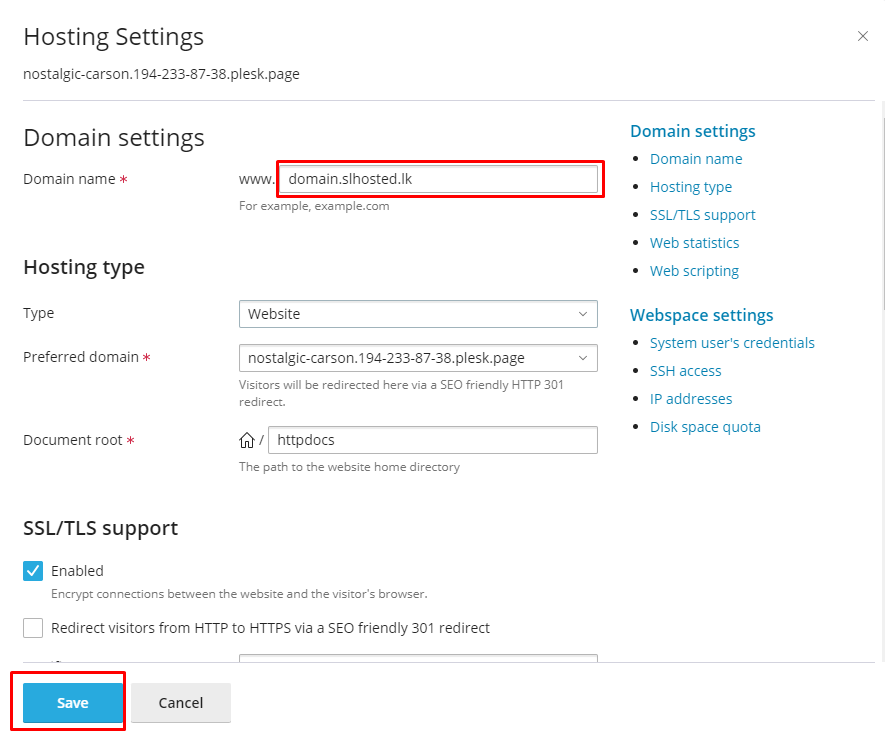 Note: Once you change your main domain name, all subdomains will be automatically changed under the created main domain.