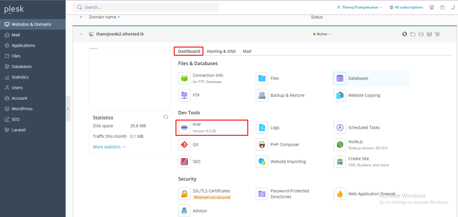 2. Select Dashboard → PHP