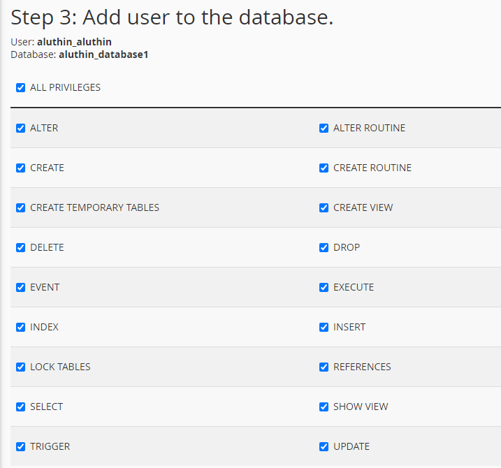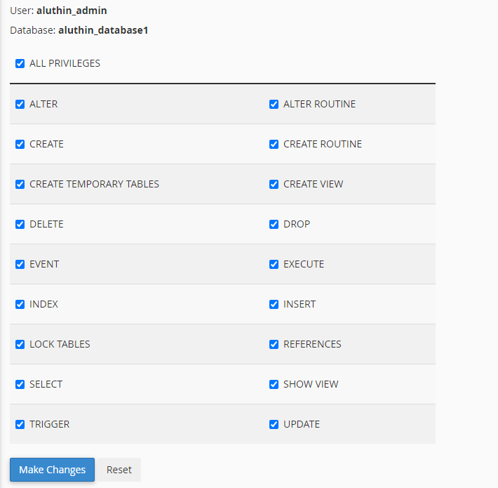 You will need to set correct privileges to the MySQL User. In the following example, we shall grant all privileges to be able to maintain our MySQLDatabase without any restrictions, so you simply need to choose the All Privileges option and click on the Make Changes button:
