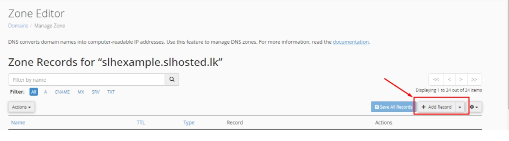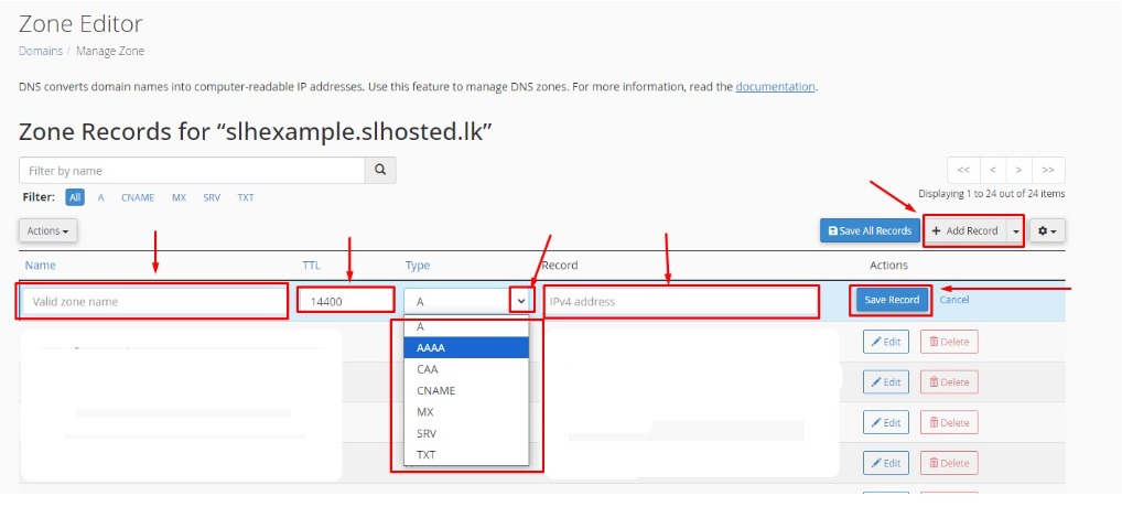 - Enter the type of DNS record (A, CNAME, MX, etc.), the name, and the value (such as IP address or target domain).