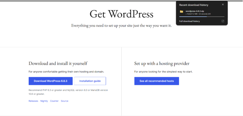 - Click on the “Download WordPress” button to get the latest version as a .ZIP file.