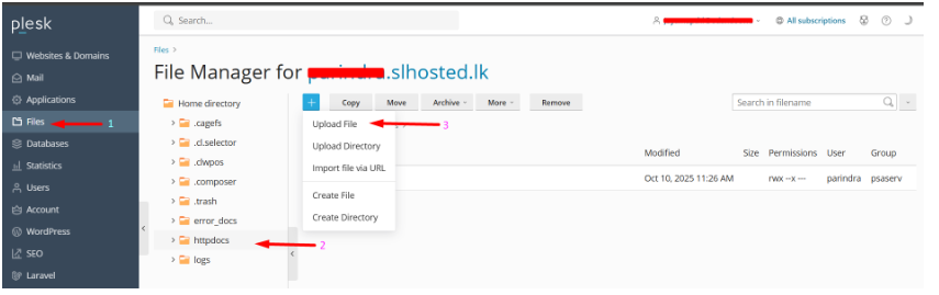 3. Inside /httpdocs/, click the ‘+’ button to upload files.