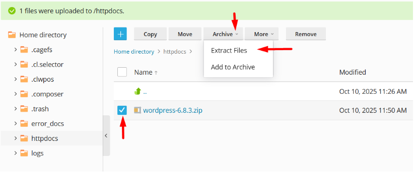 5. Once uploaded, select the file and click Extract Files to unpack WordPress.