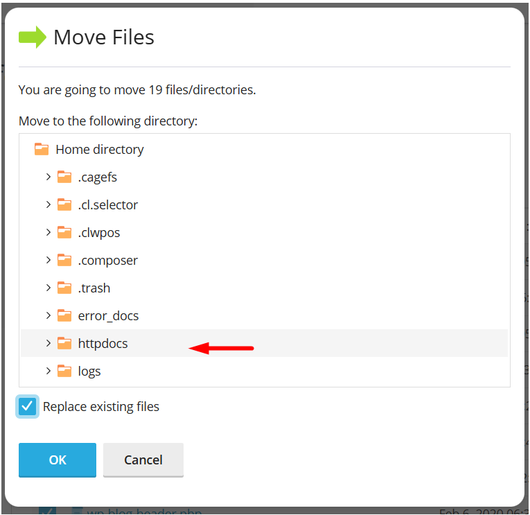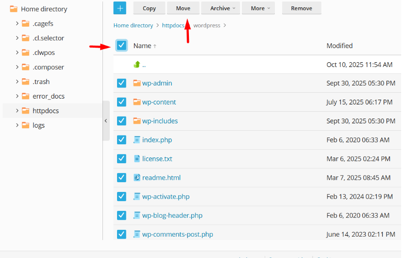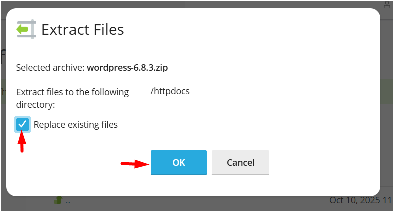 1. After extraction, if WordPress files are inside a subfolder (such as /httpdocs/wordpress/ ), move all files and folders from that directory into /httpdocs/.