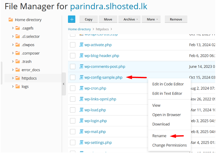 1. Locate the /wp-config-sample.php/ file in the uploaded WordPress Home directory.