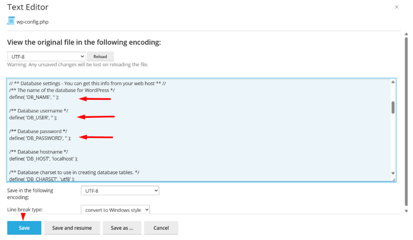 3. Edit /wp-config.php/ using a text editor or Plesk’s File Manager editor.