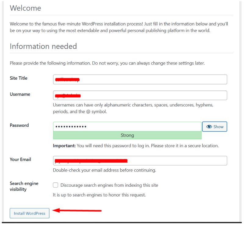 Make sure to note down the database name, username, and password — you’ll need them later to configure WordPress.