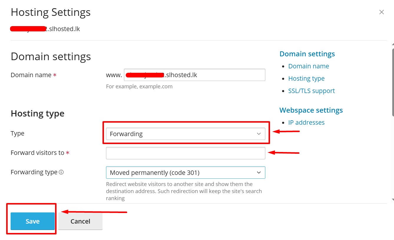 In the “Hosting Type” section, change from Website Hosting to Forwarding.