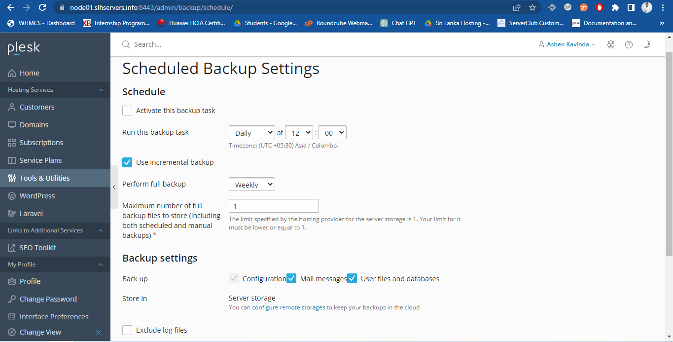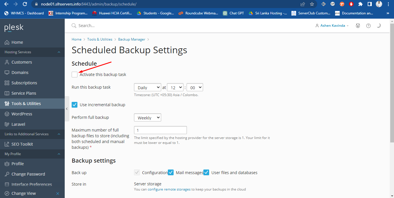 - Whether to store the backup on the server or in an FTP storage. If no FTP storage has been configured, click Configure to set one up.