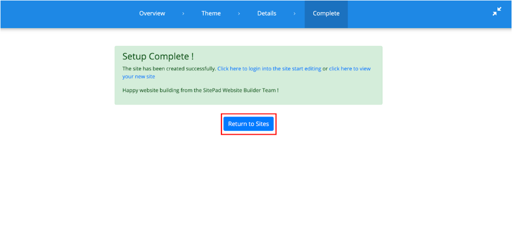 Step 07: You’ll display the below notification when a successful installation. Click Return to Sites to goto your website